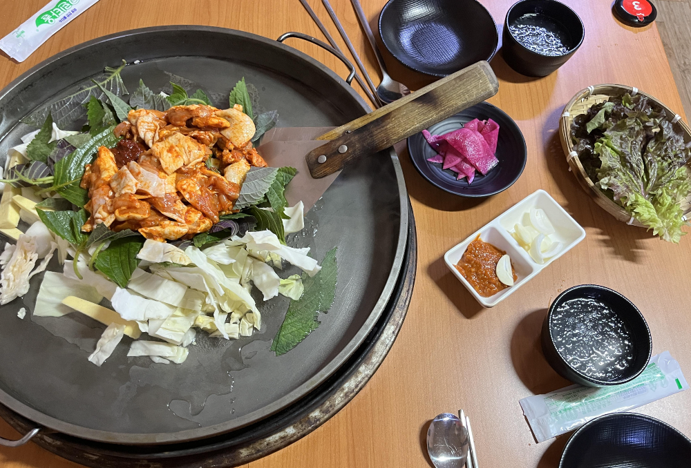 저희는 닭갈비 2인분을 시켰습니다. 3인분을 시킬까 고민을 했지만 볶음밥을 꼭 먹기 위해 인원수에 딱 맞춰 시켰습니다. 닭고기들은 큼지막하게 썰어져 있었습니다. 춘천 닭갈비라고 해서 무언가 특별한 재료가 있는 건 아닌 듯했습니다. 아마도 여행지에서 먹는 특별함이 더해져서 더 맛있는 걸까? 하는 생각을 했습니다.