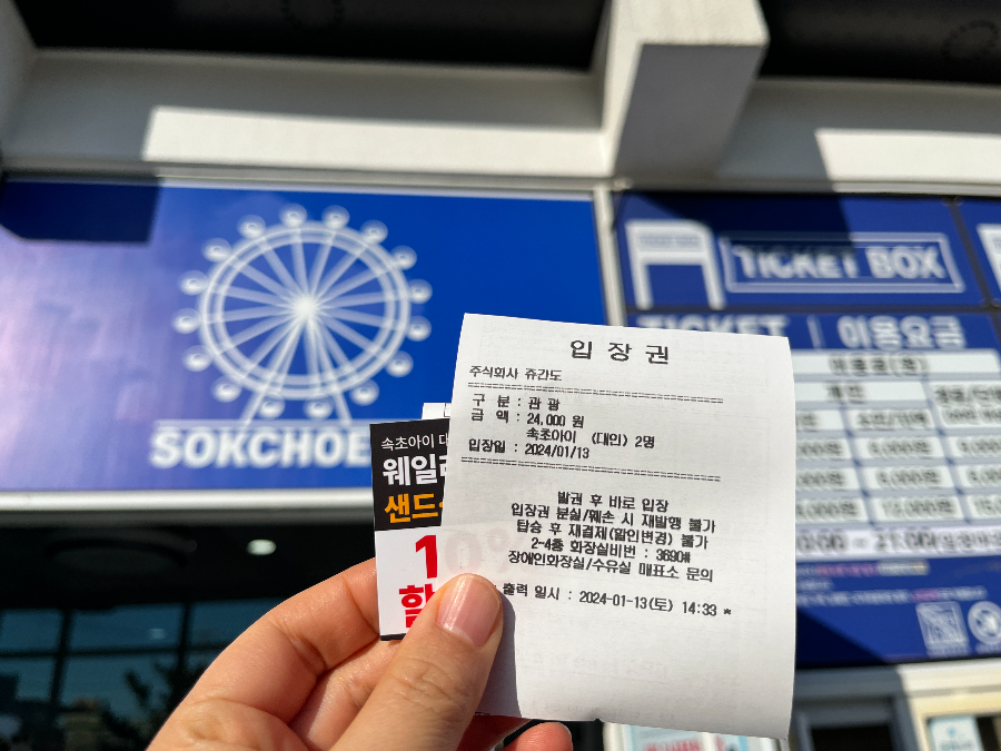 입장권이 놀이동산과 비슷할 줄 알았는데…15분 타는 거라고 그냥 영수증이 나와서 조금 실망했습니다. 아무리 짧은 시간이라도 오래 기다리는데 조금만 더 신경을 써주시면 좋을 것 같습니다. 입장권과 같이 준 것은 속초 샌드 할인권 티켓입니다. 저희는 사용하지 않았습니다.