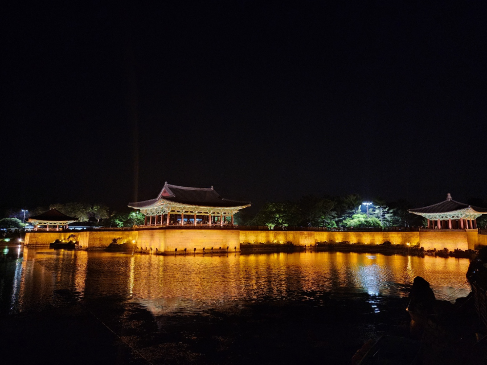 총 둘레 1,000m로 가장자리에 굴곡이 많아 어느 곳에서 보아도 연못 전체가 한눈에 들어오지 않는다고 합니다. 밤이라서 그런지 더욱더 그런 모습이었습니다. 다 다른 곳 같은 느낌이 들었습니다. 안압지에는 백제의 조경 기술이 접목되어 신라 속에 고구려, 백제의 문화가 녹아들어 있다고 합니다. 역사적인 문화 예술을 느껴보고 싶다면 낮에 방문하시길 추천드립니다.