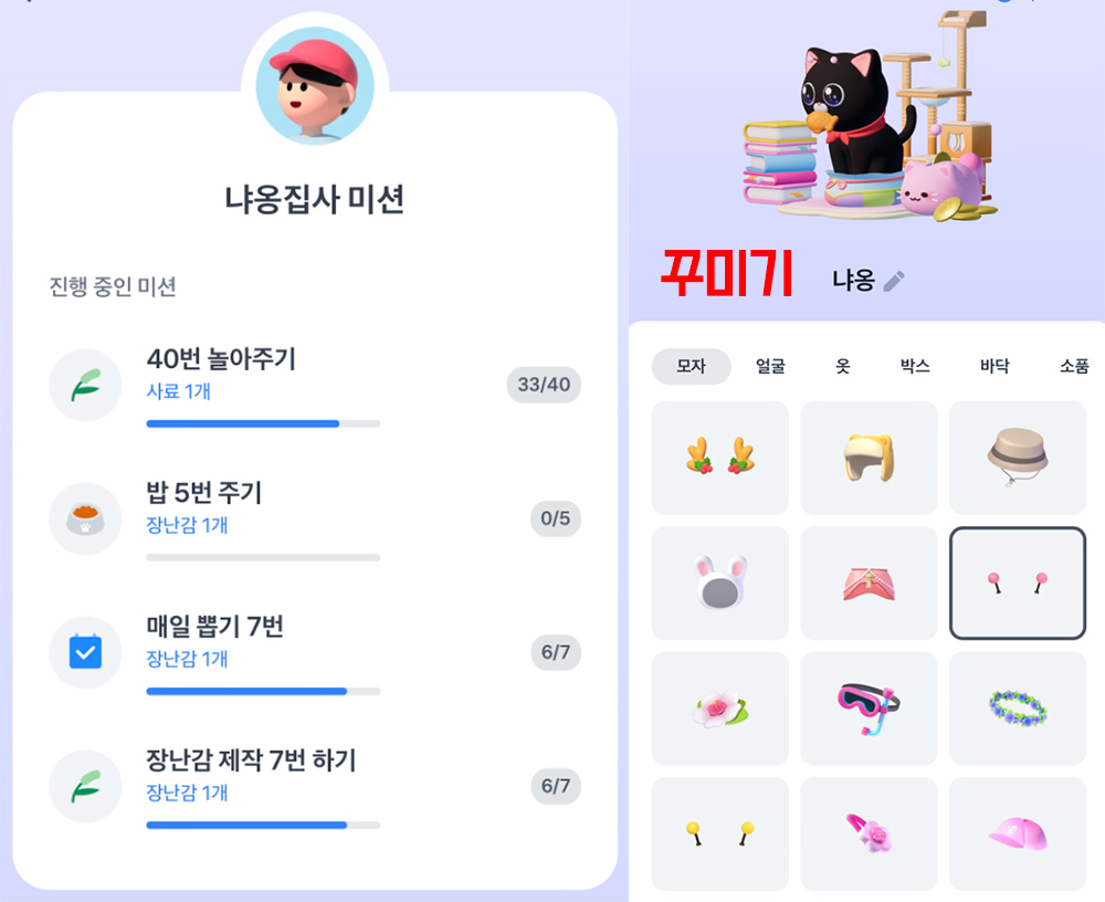 놀아주기, 밥 주기는 하루 40번까지 정해진 개수에 따라 사료와 장난감을 1개씩 줍니다. 예를 들어 사료 5개 주면 1개 증정, 10개 주면 1개 증정, 20개 주면 1개 증정.... 그리고 장난감과 사료를 받을 수 있는 상황이 되면 메인에 팝업으로 알려주기 때문에 집사미션을 누르지 않아도 받을 수 있습니다. 현재 진행상태를 파악하기에 좋습니다.