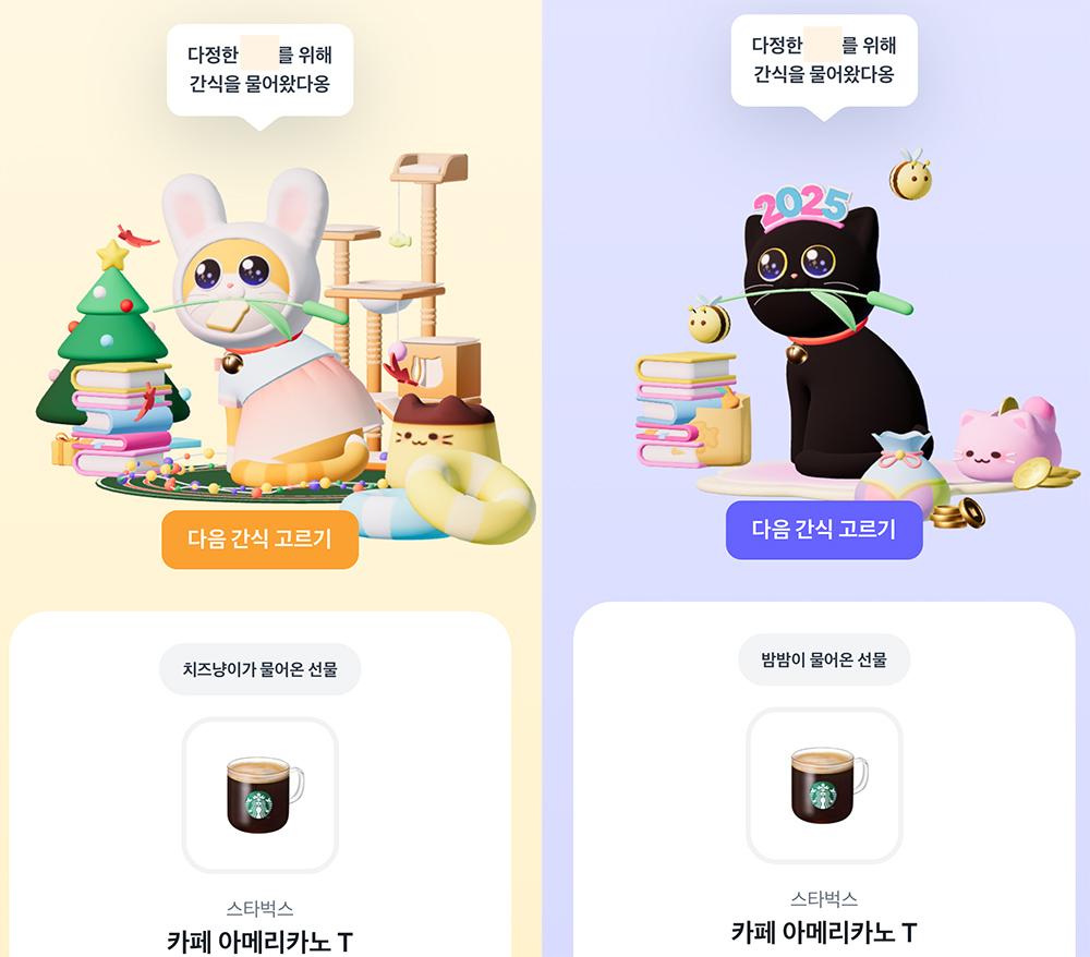 기본적인 개념은 고양이는 4단계의 레벨을 거치게 되고, 사료를 줘서 에너지를 모으고, 장난감으로 레벨 경험치를 쌓게 됩니다. 고양이를 다 키우게 되면 처음 고양이 키울때 설정했던 브랜드콘을 받게 됩니다. 고양이의 종류는 10가지가 있고, 이벤트나 직접 구매를 통해 아이템들을 모을 수 있습니다. 최종 고양이의 모습은 꾸며진 상태 그대로로 진행되고, 처음 고양이를 고를 때 선택했던 기프트콘을 받게 됩니다. 토스의 기프트콘의 이름이 브랜드콘입니다. 스타벅스는 작년까지 없었는데 작년 겨울부터 새로 생겼고, 앞으로 더 많은 브랜드가 생기길 바라는 중입니다. 사진은 저의 최근 고양이 2마리의 모습입니다. ^^ 너무 귀엽죠~~