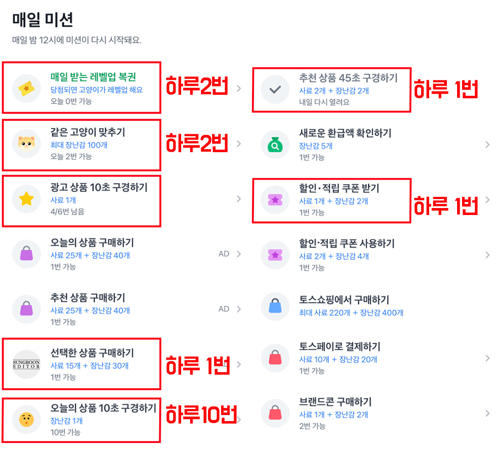 매일 정해진 이벤트들이 있습니다. 제일 수고로움이 가득한 공간입니다. 무료로 진행 가능한 부분은 빨간 네모로 표시해 두었습니다. 요것들을 매일 진행하시면 됩니다. 가능 횟수가 정해져 있기 때문에 그에 맞춰서 진행하시면 됩니다. 대부분 광고를 보는 것으로 이루어져 있습니다. 광고상품 보는 것들은 시간 동안 스크롤을 이동하면서 광고를 봐야 합니다. 조금 귀찮긴 해도 버스를 타고 이동하거나, 무언가 기다리면서 지루한 순간들을 이용해서 하면 좋습니다.