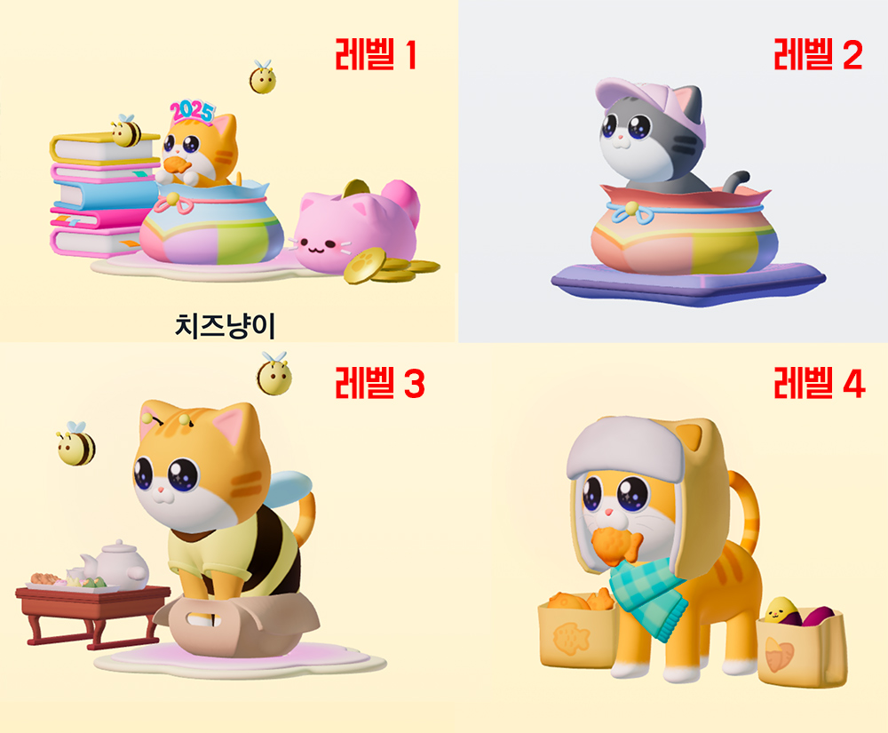 사랑하는 토스 고양이의 레벨 단계별 변화입니다. 고양이는 10 종류가 있으며 단계는 모두 동일하게 진행됩니다. 개인적으로 레벨 1,3이 제일 귀여운 것 같습니다. 레벨 4단계가 너무 시간이 오래 걸려서... 단계별 경험치 조율이 조금 있었으면 하는 바람이 있습니다. 레벨 1이 제일 귀여운데 너무 빨리 사라지니깐, 아쉽다고나 할까요...^^