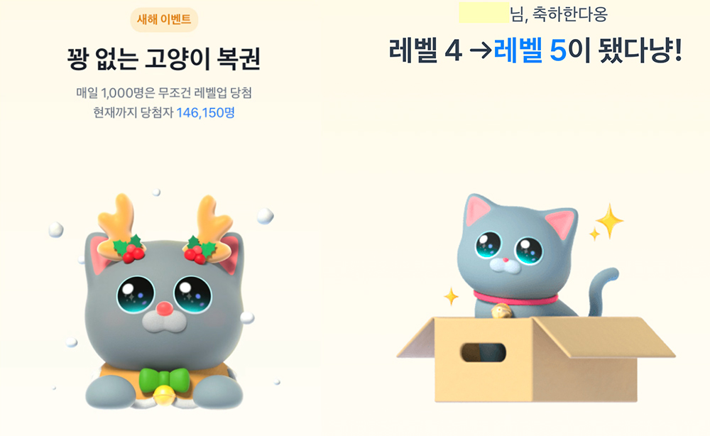 복권은 레벨업을 해주는 뽑기 복권인데, 뻥 같았는데 제가 한번 레벨업에 성공했습니다. 레벨 5가 되어서 바로 브랜드콘을 받을 수 있었습니다. 복권을 긁으면, 고양이 3마리 얼굴이 나오고 3마리의 고양이가 동일한 얼굴이면 당첨입니다. 매일 1,000명은 무조건 당첨이라고 하지만, 쉽지는 않습니다. 같은 고양이 맞추기는 퍼즐 게임이라서 게임을 좋아하시는 분들은 하루 2번 재밌게 즐겨주시면 되고, 게임을 안 좋아하시는 분들은 게임을 그냥 켜두면, 시간이 지나면 알아서 사료나 장난감이 증정됩니다.