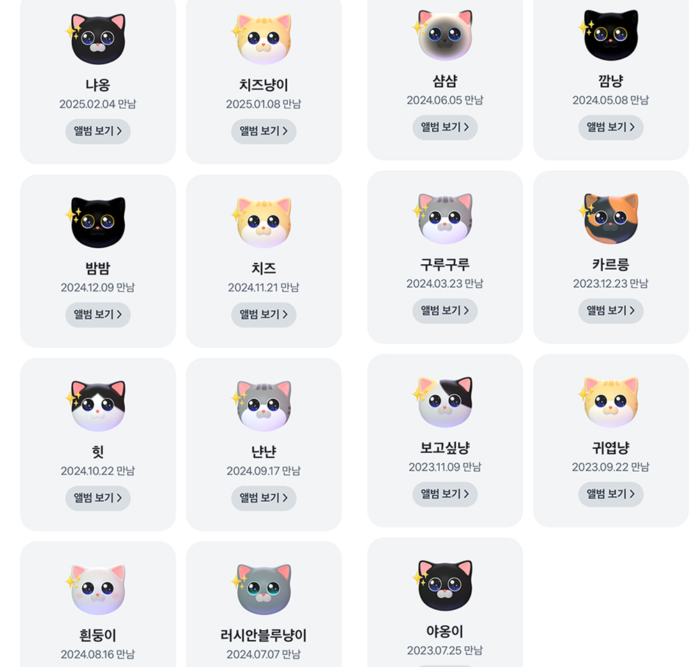 이게 늘 같은 모습이긴 하지만, 습관처럼 정말 고양이를 키우듯 아이템을 모으기도 하면서 실제로 고양이를 키우지 못하는 아쉬움을 달래고 있어요. 뻔하지만, 집사가 된 것 같은 마음으로 하고 있어요. 그러다 보니 벌써 14마리의 고양이 집사가 되었어요 ^^ 앞으로도 사라질 때까지 꾸준히 할 것 같아요.