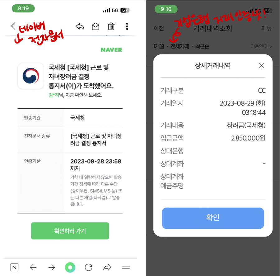 일단 인증캡쳐 했습니다! 저는 네이버 전자문서를 사용하고 있어서 국민비서와 국세청 소식은 네이버 메일로 옵니다. 링크를 따라 가면 전자문서에서 확인할수 있습니다. 메일을 확인하고 근로장려금을 신청한 통장을 확인해보니 이미 돈이 들어와있었습니다. 국세청이라고 딱!! 써있습니다. 5월에 신청하고 8월말에 받으니까 약 3개월의 기다림이었습니다. 기다림의 즐거움이었습니다.