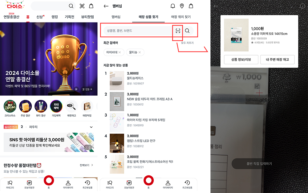 그럼 다이소몰 재고조회를 하고 원하는 물건을 찾으러 다이소에 갑니다! 넓고 넓은 다이소 매장에서 원하는 물건을 찾기란 어렵죠. 물론, 직원분들의 도움으로 빠르게 찾으시거나, 매의 눈으로 빠르게 찾으실 수 있지만, 간혹 꽁꽁 숨어있는 물건들이 있습니다. 때로는 원하는 물건의 카테고리가 생각한 방향과 다를 때도 있기 때문이죠. 그럴 땐 다이소 매장 제품을 검색하시면 어느 자리에 있는지 쉽게 아실 수 있습니다.