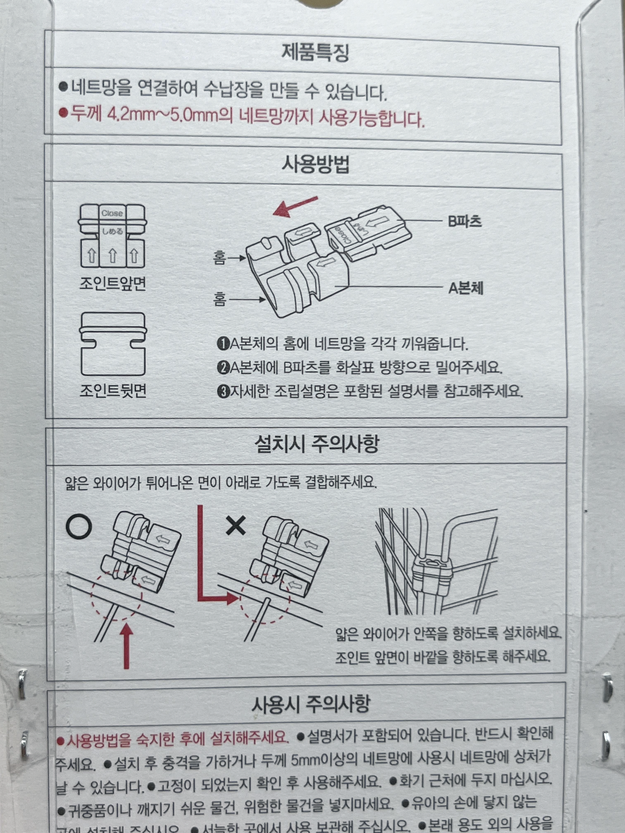 엇 모양이 삐뚤삐뚤한 게 이상합니다. 이유는 조인트 조립을 잘못했기 때문입니다. 설명서에 나온 대로 잘 꽂으셔야 합니다. 조인트 가운데 홈 부분이 네트망 선을 넣는 곳입니다. 홈에 잘 맞춰서 사이를 잘 메꿔주세요. 그럼 단단하게 고정이 됩니다. 조인트 사용이 불편하시다면 케이블타이를 이용하셔도 괜찮습니다. 대신 자른 면을 안쪽으로 넣어주셔야 합니다.