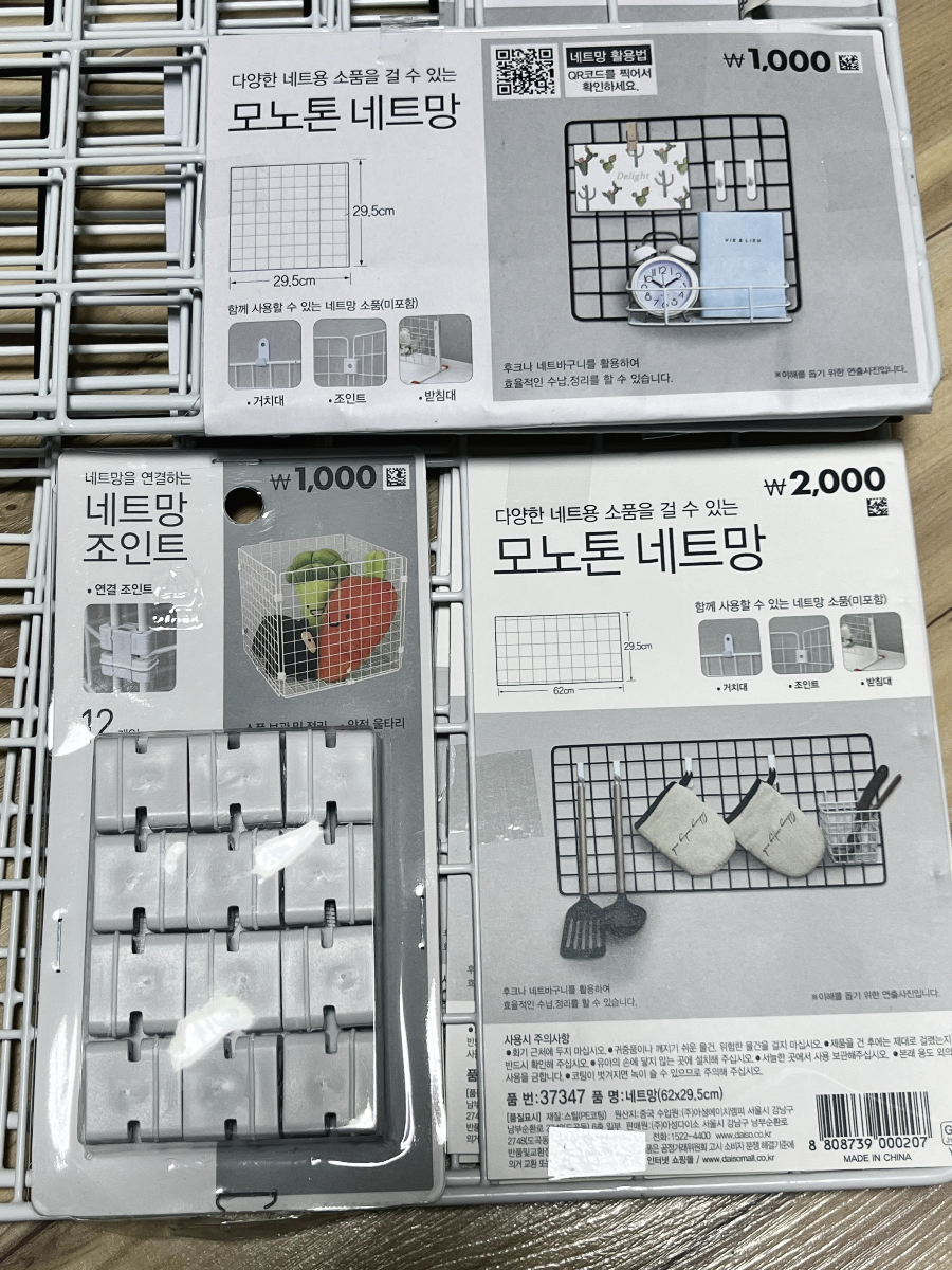 요즘 바쁘다는 핑계로 글 쓰러 자주 오지 못했습니다. 그래도 다이소에는 매주 놀러 가서 구경하고 아이템들을 구매했습니다. 그중에 재미난 아이템이 있어서 추천템으로 추천해보려고 합니다. 철망이라고 불리는 다이소 모노톤 네트망입니다. 네트방을 단독으로 사용하여 정리를 효율적으로 하실 수 있고, 네트망을 조인트로 연결하여 바구니를 만들어 수납용으로 사용하실 수 있습니다. 오늘은 좁은 공간에 빨래 바구니를 만들기 위해 다이소 네트망과 조인트를 구매했습니다. 네트망 종류가 크기가 여러 개 있으므로 조립형으로 사용하실 때 원하시는 크기를 정하셔서 맞는 개수를 잘 맞춰서 구매하셔야 합니다.