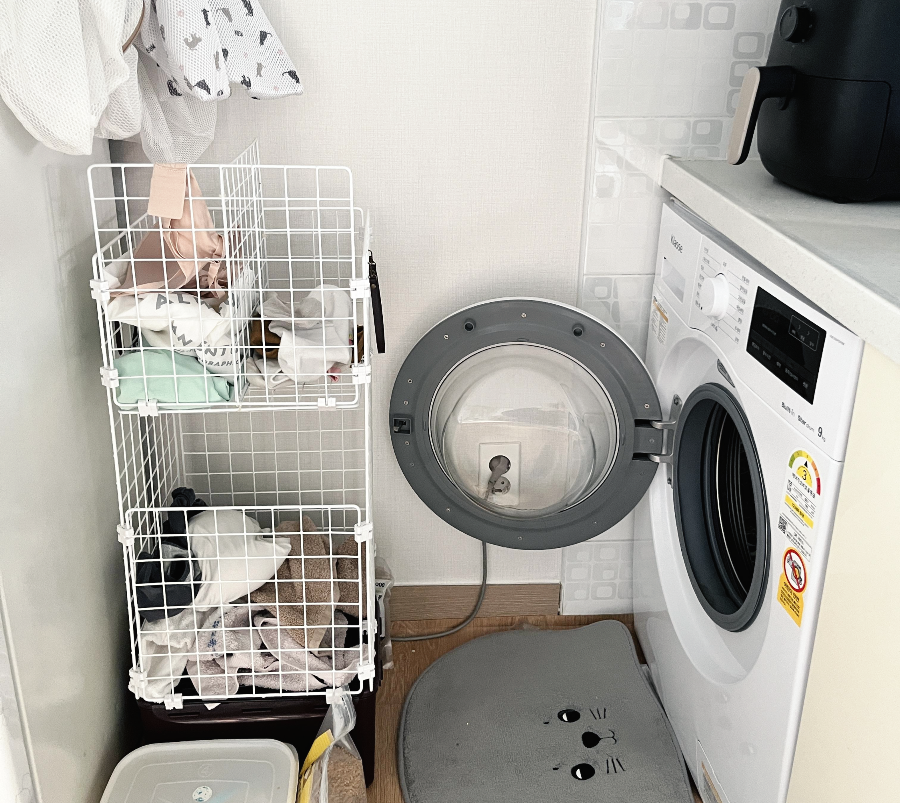 원룸이라 세탁기와 냉장고 사이에 작은 홈에 딱 맞는 빨래 망이 생겼습니다. 직사각형 3개, 정사각형 4개를 사용하고 1개는 칸막이용으로 추가를 해보았습니다. 그리고 조인트 2개, 손잡이 2개입짜리 1개를 샀습니다. 조금 더 긴 걸 사도 될 뻔했다는 아쉬움도 있었지만, 만든 지 한 달이 훌쩍 지났는데도 잘 사용하고 있습니다. 네트망이라서 환풍도 잘 돼서 젖은 수건 같은 것도 말려놓을 수 있어 좋습니다.