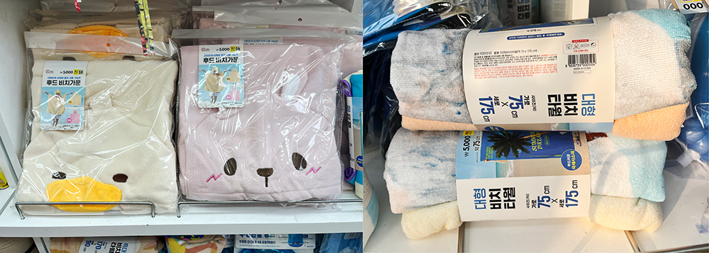 기본적으로 직사각형 형태의 비치타올과 단추가 달려 가운처럼 걸칠 수 있는 아이템도 있습니다. 아이들을 위해 귀여운 동물 모양의 타월도 있으니 원하시는 형태를 고르시면 좋겠습니다.