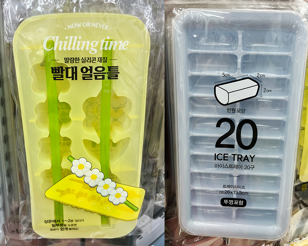 기존에 사각형과 원형 아이스트레이에 이어 길죽한길쭉한 모양과 빨대 얼음틀까지 새로 나왔습니다. 요즘 환경을 생각하여 텀블러 사용을 많이 하시는데요. 기존 사각형과 원형 스타일의 얼음이 크기에 안 맞는 경우가 있었습니다. 그래서 텀블러에 넣어 하루종일 시원하게 물과 음료를 마실 수 있도록 얇고 길게 얼음틀이 나왔습니다. 사람들이 지퍼팩에 나무젓가락을 꽂아 길쭉한 모양으로 얼려서 사용하시는 걸 봤었는데, 번거롭지 않게 얼음트레이가 나와줘서 너무 고마운 다이소입니다. 신박한 신상 아이템이 많이 나오니 다이소에 출석체크하듯 자주 가게 됩니다.