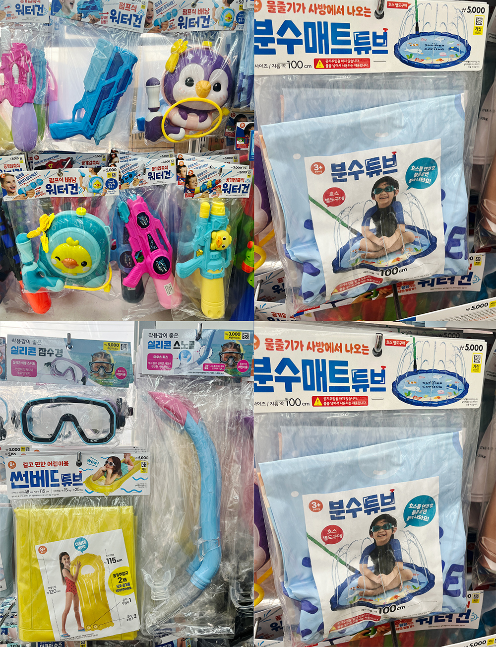 튜브도 있으니 꼭 챙겨주세요. 튜브도 기본형과 원형 공 모양이 있고, 분수 매트 튜브까지 다양한 디자인이 있습니다. 해수욕장에서는 한번 사용할 때 대여료를 하거나 구매를 해야 합니다. 구매 가격이 만만치 않고, 대여도 남이 사용하던 것들을 사용해야 하기 때문에 찝찝하죠. 그 모든 고민을 저렴한 가격으로 해결할 수 있습니다. 정말 다이소는 꿀템이 한가득 있습니다.