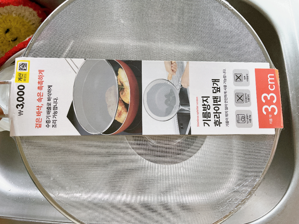 후라이팬 뚜껑을 열고 요리를 해야할때 여기저기 기름이나 양념장이 튀어 고민이 많이 되시죠? 특히 빨간 양념을 볶을때 여기저기 튀는 고춧기름 ㅠㅠ 정말 가스레인지 청소하기 귀찮습니다. 그때 사용하려고 종이도 덮어보고 해봤는데 불에 탈까 걱정도 되고 공기가 통해야하니 열고 닫기 불편한데 다이소 후라이팬덮개는 환풍이 되기 때문에 좋습니다.