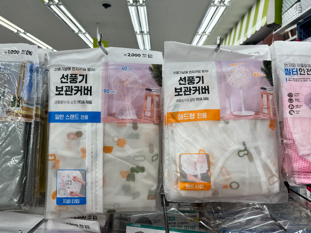 다이소에는 다양한 선풍기 커버가 있습니다. 선풍기 커버를 구매하시기 전에 선풍기만 감쌀 건지 전체를 다 감쌀 건지 정하신 후 사러 가셔야 합니다. 특히 전체를 다 감싸실 때 선풍기마다 크기가 다르므로 맞춰서 사지 않으면 안 맞을 수 있기 때문입니다. 그래서 저는 선풍기만 커버하는 형태를 구매했습니다.