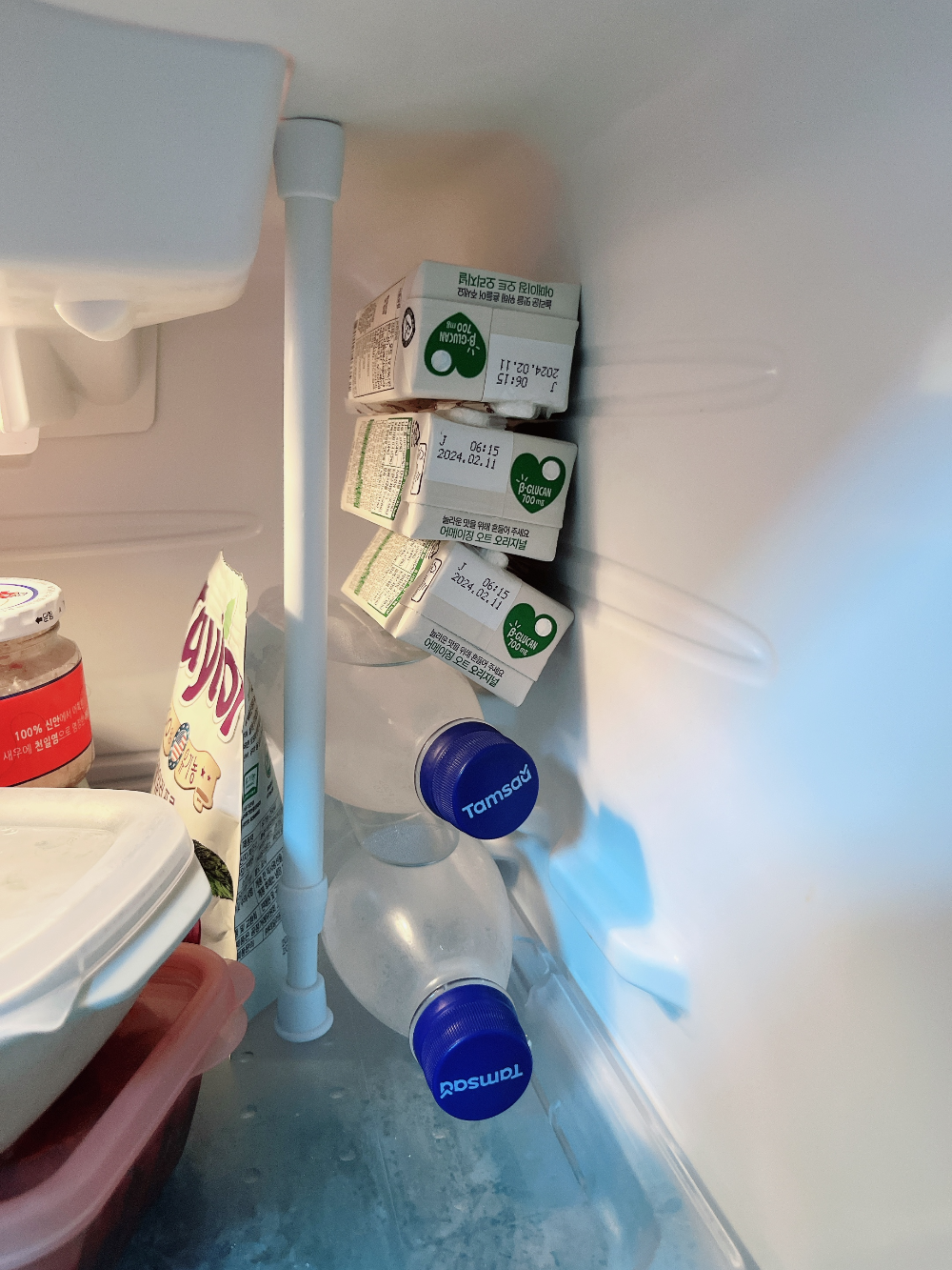 다이소에는 다양한 압축봉이 있습니다. 주로 커튼이나 정리함을 걸어둘 용도로 구매하지만 저는 냉장고를 정리할 용도로 구매했습니다. 맥주나 음료수 등을 공간 활용하여 정리할 수 있기 때문입니다. 두 개를 사용하는 게 제일 안정적인데 제가 사러 갔을 때 한 개뿐이어서 하나만 설치되어 있습니다. 그래도 다행히 흐트러짐 없이 사용하고 있습니다. 원룸에 제공되는 냉장고를 사용하다 보니 공간이 협소해서 김치 같은 저장해야 하는 음식이 생기면 공간 활용을 정말 잘 해야 하거든요! 그래서 선택한 압축봉!! 손님들이 찾아오거나 해서 맥주 양이 급격하게 늘었을 때! 설치해두면 더욱 좋습니다 ^^ 세워서 보관하는 것보다 훨씬 많이 보관되니 냉장고에 음료를 많이 보관하고 싶으신데 공간이 협소하시다면 한번 사용해보세요! ^^