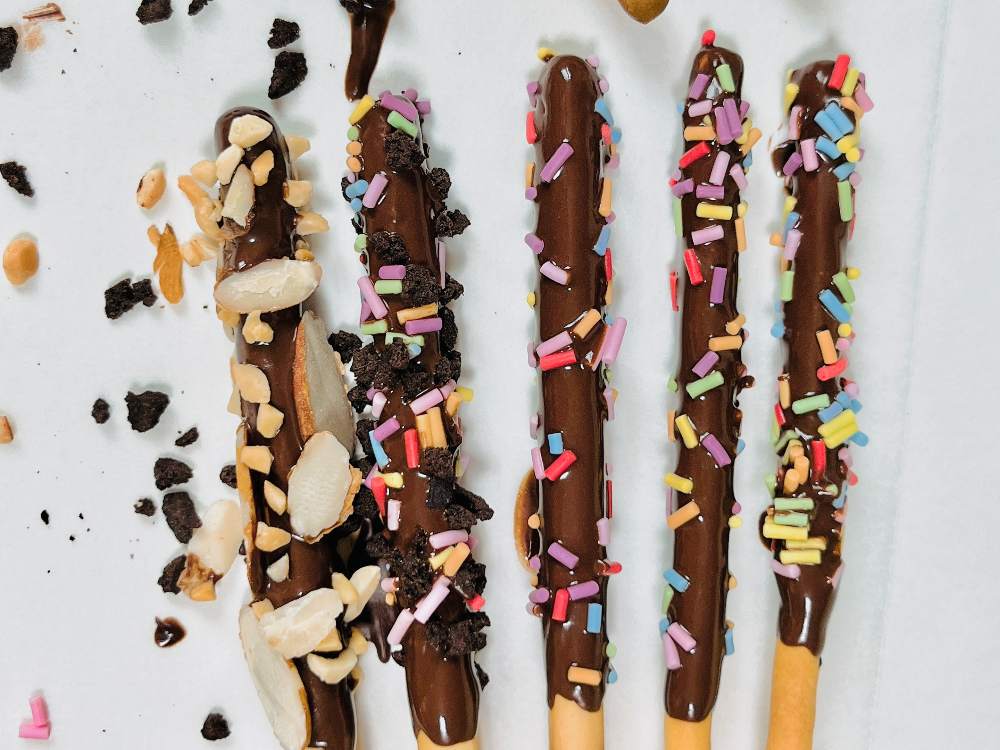 막대 스틱에 녹은 초콜릿을 발라주세요. 잘 바른 후 그대로 말리거나 크런치나 스프링클을 발라주세요. 개인적으로 저는 크런치를 바르는 게 좋았습니다. 그대로 깨끗하게 말리기가 쉽지 않았기 때문입니다. 어딘가 눌린 자국이 나기 때문에 크런치를 발라서 초콜릿을 굳혀주시면 어느 곳에서 보아도 눌린 자국이 없어서 좋았습니다.