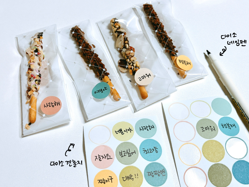 요건 다이소 추천템들을 활용해서 조금 더 꾸며보았습니다. 빼빼로 포장을 마치고 아쉬움을 달래주려고 고민하다가 지난번에 구매했던 견출지를 활용했습니다. 빼빼로에 원하는 문구들을 써보았습니다. 조금 간결하게 간단한 단어 형태로 담았습니다. 조금 큰 크기의 견출지라면 문구를 더욱 많이 써줄 수 있을 것 같습니다. 한 층 더 업그레이드되었습니다. 나만의 선물 완성입니다.