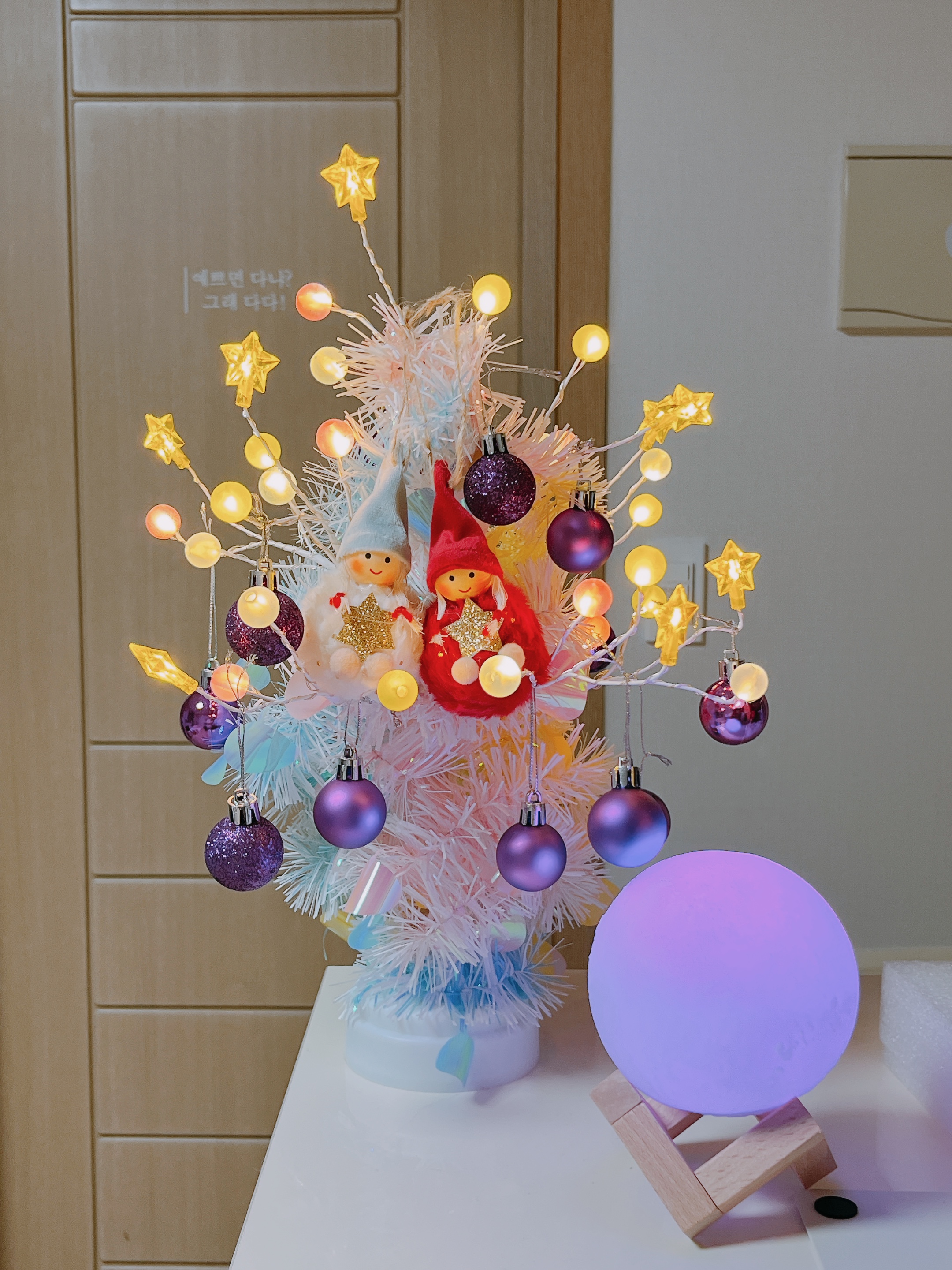나뭇가지만 있는 게 조금 추워 보여서 보슬보슬 털을 붙여주었더니 겨울나무 같기도 하고 환상적인 느낌도 들었습니다. 보라색 볼 장식을 걸어주고 가운데는 요정을 달아서 마무리해주었습니다. 이전에 선물 받은 달 무드등과 함께 놓으니 더 예쁜 것 같습니다.