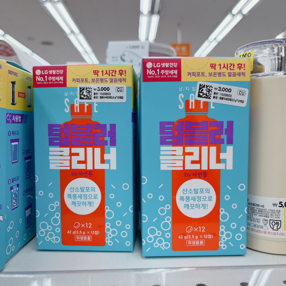 편하게 발 씻을 수 있다는 아이템이라면서 선물로 받았던 풋샴푸입니다. 어느 날 다이소에서 파는 걸 보고 깜짝 놀랐는데!! 동생네 놀러 갔더니 품절대란템이라고 쓰고 있었습니다. 다이소에서 팔기 전부터 사용하던 제품이라 다이소에서 하나 더 구매했습니다. 레몬향과 자몽향 두 가지를 사용해보았는데 개인적으로는 레몬향이 더 괜찮은 것 같았습니다. 풋샴푸의 기능은 발을 씻는 것 외에 옷에 묻은 얼룩제거용으로도 많이 사용됩니다. 세정력이 좋은 편이라 화장실 청소할 때도 사용됩니다. 이런 걸 발을 씻어도 되나? 하는 의문점이 생기지만 발에 특별한 문제는 생기지 않았습니다. 샤워기로 대충 물을 묻혀주고 풋샴푸로 찍찍 뿌리고 발끼리 쓱싹쓱싹 대충 거품을 묻히고 다시 샤워기로 씻어주면 됩니다. 당연히 꼼꼼히 씻어주는 게 더 좋지만, 저는 대충씻는 용도로 사용하고 다른 용도로도 활용하여 사용하고 있습니다.5. 묵은때 처리용! 텀블러 클리너