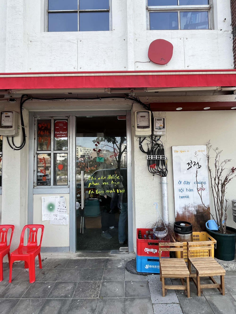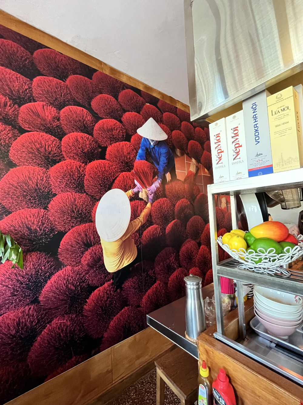 베트남의 사진이 크게 붙어 있습니다. 자리는 조금 협소한 편입니다. 자리에 앉으면 서로 왔다갔다 하기는 불편할 것 같습니다. 다행히 저희 안쪽에 사람들이 계셨는데 저희보다 늦게 가셔서 저희가 딱히 비켜주거나 하지 않았습니다. 저희가 앉은 테이블은 작은 사각 형태였는데 모서리가 제 살을 찌르기도 해서 방석이 생각났습니다. 그래도 요령껏 잘 앉으면 어느새 의자 생각은 사라집니다.