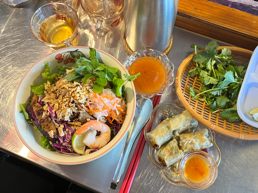 분짜와 수제 짜조입니다. 수제 짜조는 얇고 곱게 만드시기 번거로우셨을 것 같았습니다. 양이 적어서 조금 아쉬웠습니다. 분짜는 베트남 비빔국수로 따로 주신 소스를 부어서 섞어서 먹으면 된다고 말씀해주셨습니다. 바삭함이 좋다고 했습니다.