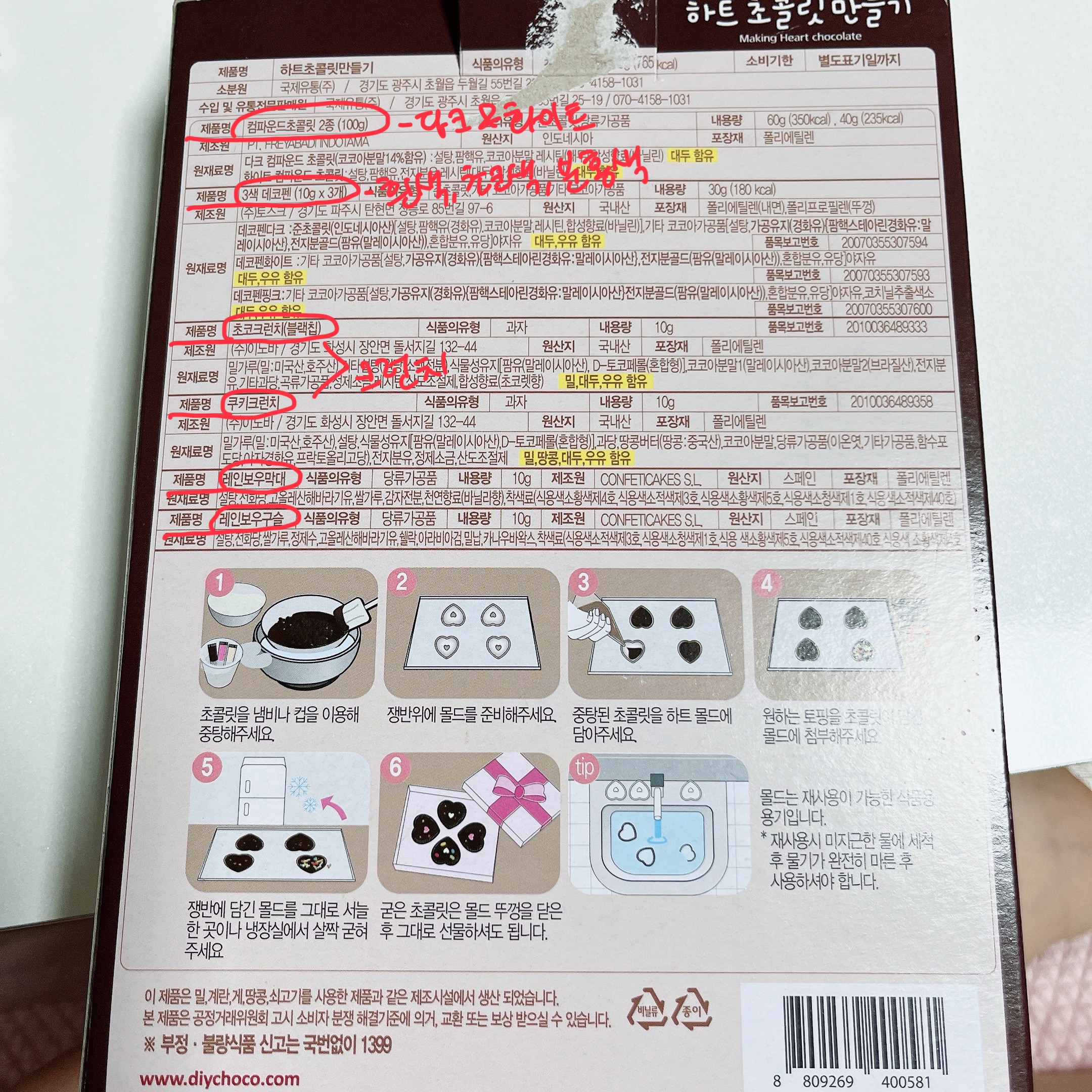 오천원으로 구성된 HEART 초콜릿 만들기 세트를 발견했습니다. 하트모양의 트레이에 다크초콜릿과 화이트 초콜릿으로 구성된 느낌이었습니다. 소비기한도 내년 1월까지라 넉넉했습니다. 구성품을 보기 위해 뒷면을 참고하였습니다.