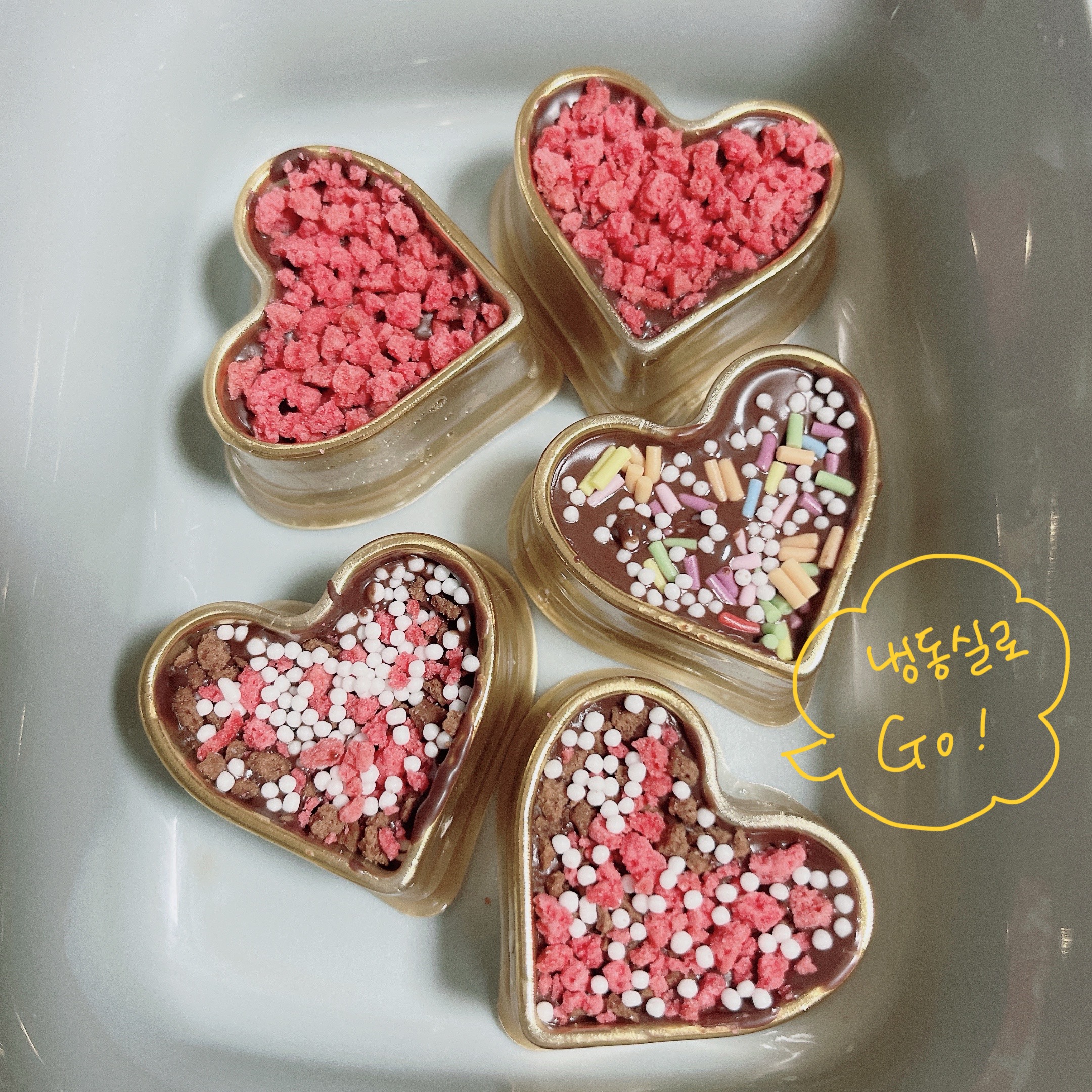 중탕한 초콜릿을 몰드에 다 넣었다면 냉동실에 잠시 넣어둡니다. 금세 굳기 때문에 몰드를 그대로 사용하실 때는 뚜껑을 덮어서 선물하시면 되고, 저처럼 분리하시고 싶으신 경우 뒤집어서 살짝 톡 해주면 초콜릿이 빠집니다. 빠진 초콜릿을 잘 세워서 윗부분에 잘 꾸미시면 초콜릿 만들기가 완성됩니다.