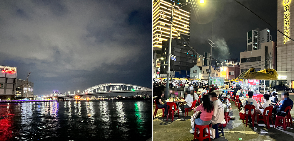 포장마차거리를 쭈욱 둘러보았는데 오픈런을 하지 않고서는 빈자리 찾기가 힘든것 같았습니다. 저희는 1차를 마치고 2차로 포장마차 거리를 산책했는데, 자리가 꽈악 차 있어서 좁은 틈에 껴서 먹거나 기다렸다 먹어야 했기에 한적한 곳을 찾았습니다. 젊은이들은 포장마차 거리에 모두 몰리다 보니 야외 테이블을 빼고 점포 내부는 대부분 한가한 편이었습니다. 아무래도 모두 밤 낭만, 바다 낭만을 즐기는 것 같았습니다. 이제는 북적거림보다는 한가함을 찾다 보니, 여유롭고 시원하게 먹을 수 있어 좋았습니다.
