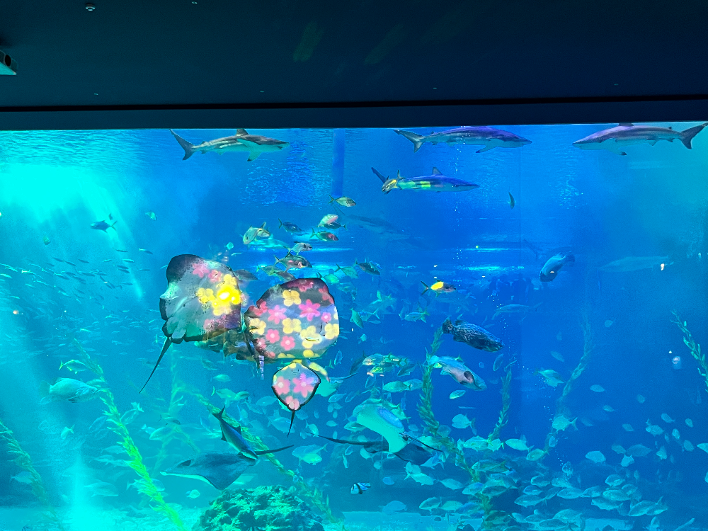 메인수조에서는 해녀물질 공연과 가오리 식사시간 공연이 있습니다. 저는 가오리 식사시간 공연만 보았습니다. 조명이 없어도 너무 귀여운데 꽃무늬 조명을 쏴주니 너무 귀여웠습니다. 위쪽 통로를 통해 물고기가 내려오면 가오리들이 차례대로 먹는 공연이었습니다. 자세히 보시면 입을 앙 벌리고 물고기를 먹는데 물고기를 놓치거나 하면 아쉬움의 탄성이 나왔습니다. 생각보다 반응도 좋고 귀여워서 재밌게 보았습니다. 눈이 나쁜 저는 핸드폰으로 확대해서 보았습니다. 시력이 안 좋으시다면 저와 같은 방법으로 보셔도 좋습니다. ^^