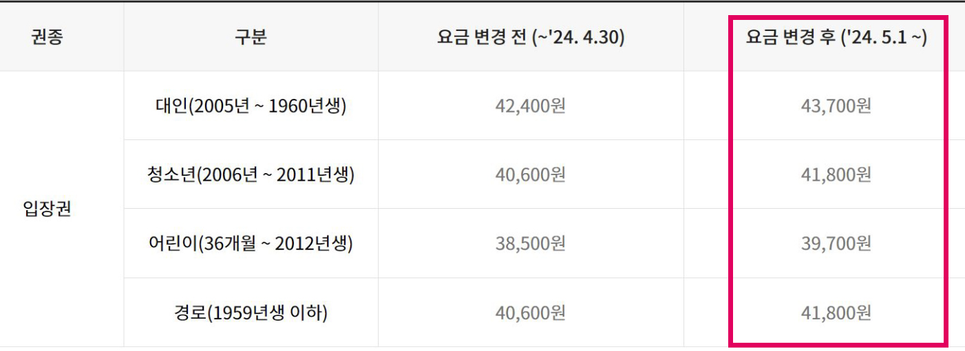 입장권 구매 가격입니다. 5월 1일부터 요금이 변경되니 일정에 따라 요금을 확인해주세요.