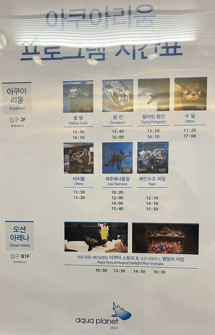 프로그램 시간을 잘 기억하고 계셔야 기다리는 시간을 줄이실 수 있습니다. 전시공간들을 구경하고 시간에 맞춰 정해진 장소에 가면 특별한 공연들을 보실 수 있습니다. 특별히 좋아하시는 동물이 있다면 시간을 맞춰주세요. 구경 중간에는 따로 프로그램 시간을 확인하는 곳이 없어 처음에 엘리베이터에서 찍어놓은 시간표를 참고하였습니다. 특히 아레나 공연시간을 확인하셔서 1~2시간 전에 방문하시면 좋겠습니다. 공연을 먼저 보시고 구경을 하셔도 되기 때문에 아레나 공연 시간이 가까울 때 입장하실 경우, 입장 시 안내를 해줍니다. 저는 그 말을 참고하지 않고 구경에 집중하다 보니 아레나 시간이 꽤 남아서 기다리는 시간이 있었습니다. 기다리면서 보고 또 보고 하셔도 되지만, 여행일정 상 아쿠아플라넷 제주에 머무는 시간이 많지 않으시다면 꼭 공연시간에 맞춰 코스를 짜시길 추천드립니다.