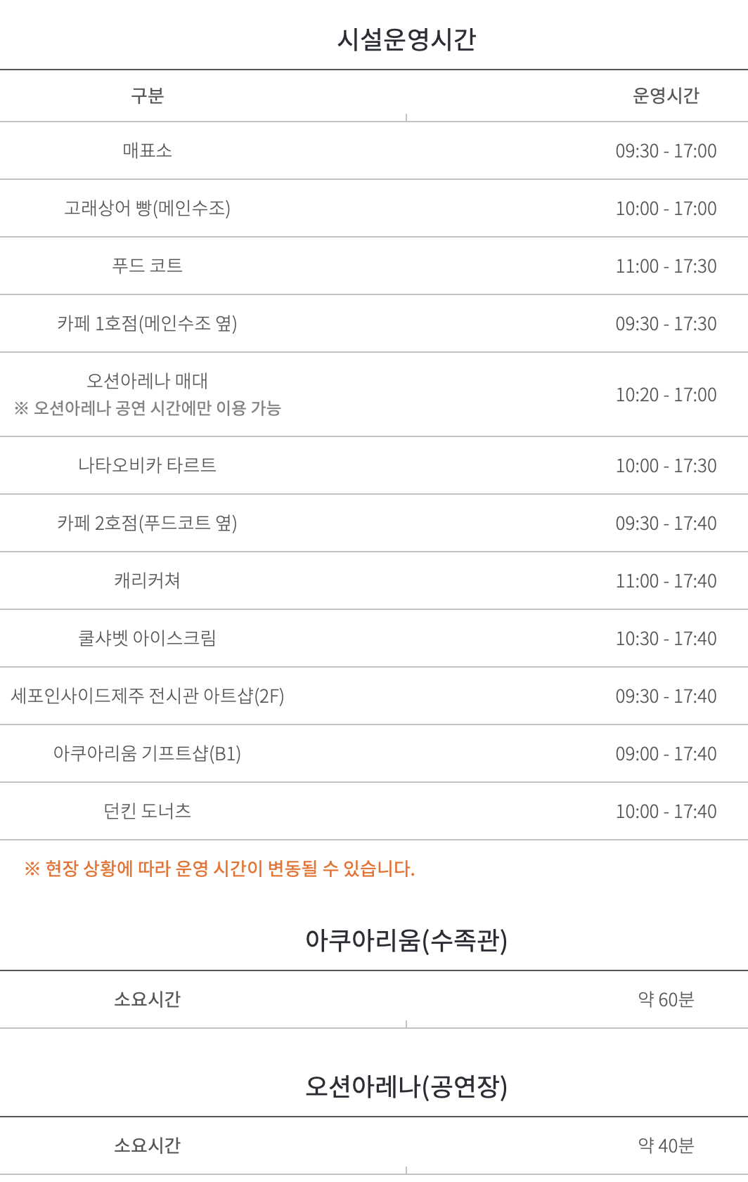 프로그램 시간을 잘 기억하고 계셔야 기다리는 시간을 줄이실 수 있습니다. 전시공간들을 구경하고 시간에 맞춰 정해진 장소에 가면 특별한 공연들을 보실 수 있습니다. 특별히 좋아하시는 동물이 있다면 시간을 맞춰주세요. 구경 중간에는 따로 프로그램 시간을 확인하는 곳이 없어 처음에 엘리베이터에서 찍어놓은 시간표를 참고하였습니다. 특히 아레나 공연시간을 확인하셔서 1~2시간 전에 방문하시면 좋겠습니다. 공연을 먼저 보시고 구경을 하셔도 되기 때문에 아레나 공연 시간이 가까울 때 입장하실 경우, 입장 시 안내를 해줍니다. 저는 그 말을 참고하지 않고 구경에 집중하다 보니 아레나 시간이 꽤 남아서 기다리는 시간이 있었습니다. 기다리면서 보고 또 보고 하셔도 되지만, 여행일정 상 아쿠아플라넷 제주에 머무는 시간이 많지 않으시다면 꼭 공연시간에 맞춰 코스를 짜시길 추천드립니다.