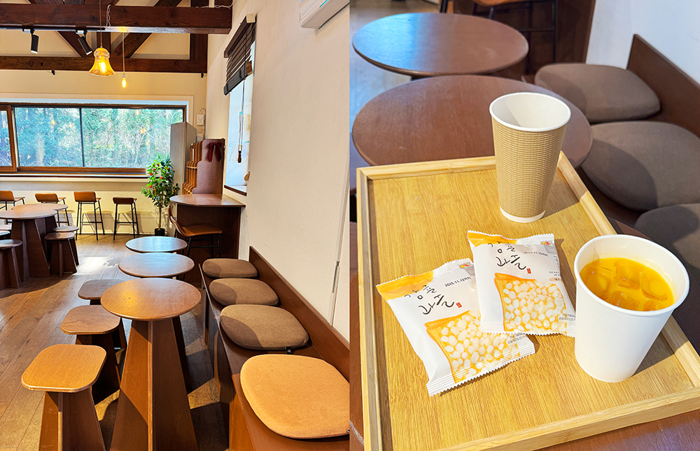 기본적인 커피 외에도 다양한 티와 제주 감귤을 활용한 특별한 디저트까지 즐길 수 있어요. 제가 갔을때 메뉴는 감귤 과즐이었어요. 예약금액이 있기 때문에 차와 과즐은 무료로 제공되었어요.