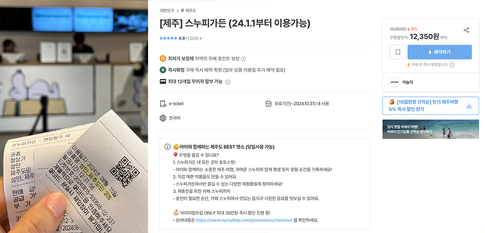 예약은 현장 예매를 하셔도 되고 미리 예약을 하실 경우, 네이버 예약이나 마이리얼트립, 야놀자, 인터파크투어에서 할인받고 예약하실 수 있습니다. 마이리얼트립에서는 다른 제주도 여행 중 가는 관광지가 있으시다면 추가 할인을 받으실 수 있다고 하니 참고해 주세요.