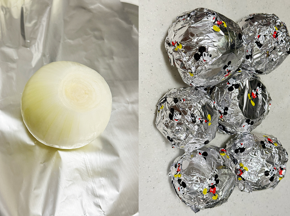 양파를 알루미늄 호일에 싸주면 공기와의 접촉을 막아주고, 땅속에 있는 것과 비슷한 효과를 받을 수 있다고 합니다. 귀찮다고 한 번에 여러 개를 싸면 안 되고, 하나씩 꼼꼼하게 싸주세요.