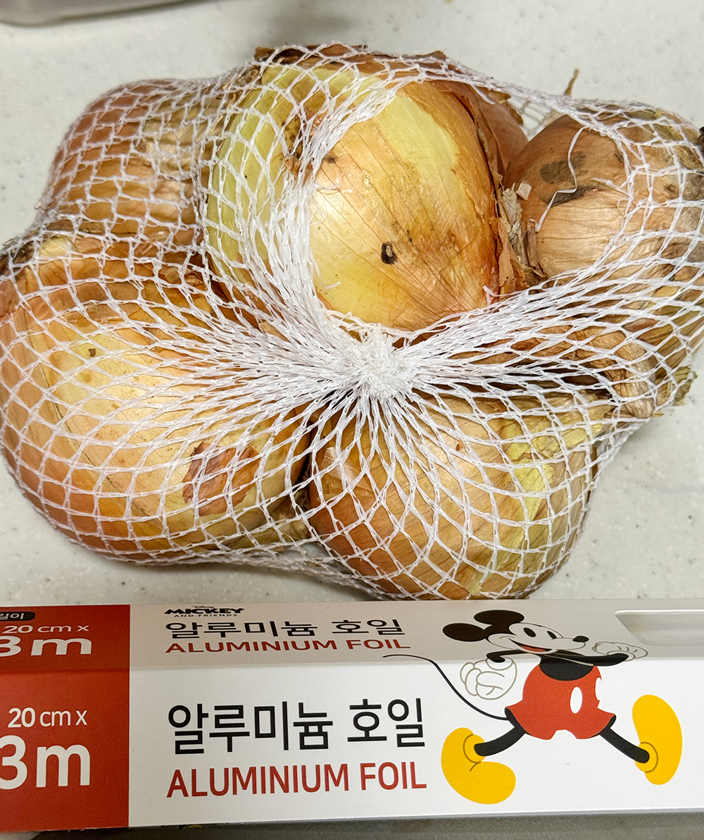 오늘은 귀여운 다이소아이템 알루미늄 호일을 소개하며, 양파를 보관하는 방법을 소개해드리려고 해요. 양파는 한두 개 구매하는 거랑 양파망을 구매하는 거랑 가격 차이가 별로 안 나기 때문에 양파망으로 구매하게 됩니다. 혼자 살고 있는 자취녀에게는 너무 많은 양이죠. 하지만, 포기할 수 없는 부분이기 때문에 양파를 오래 보관하는 방법을 익혀두셔야 합니다. 양파를 망에 걸어 시원한 곳에 두면 오래 보관이 된다고 하지만, 생각처럼 잘 되지는 않았습니다. 원룸이라는 게 시원한 곳이 별로 없기도 하고, 양파가 싹이 나거나 곰팡이가 생기기 쉬웠습니다. 역시, 냉장보관을 해야 하는 방법으로 방향을 바꿨고, 이것저것 시도 끝에 정착하게 된 방법입니다.