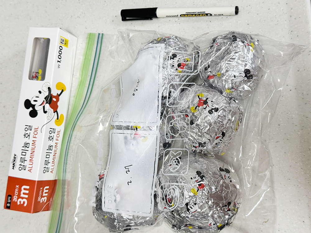 이제 마지막으로 지퍼백에 넣어서 밀봉을 시켜줍니다. 공기와 습도를 완벽 차단하기 위함입니다. 이렇게 보관을 하게 되면 그냥 지퍼백에 넣은 것보다 훨씬 오랫동안 보관하실 수 있습니다. 하나씩 정리되어 있기 때문에 양파를 먹을 때도 하나씩 편하게 꺼내어 사용하실 수 있어 좋습니다.