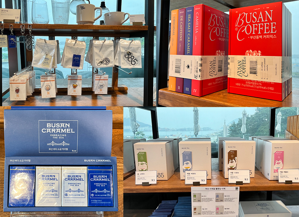 다양한 굿즈 상품과 카페에서 개발한 상품들이 있습니다. 소금 카라멜과 4 가지맛의 부산 커피믹스가 눈길을 끌었습니다. 모두 카페 스토어에서 판매되고 있습니다.
