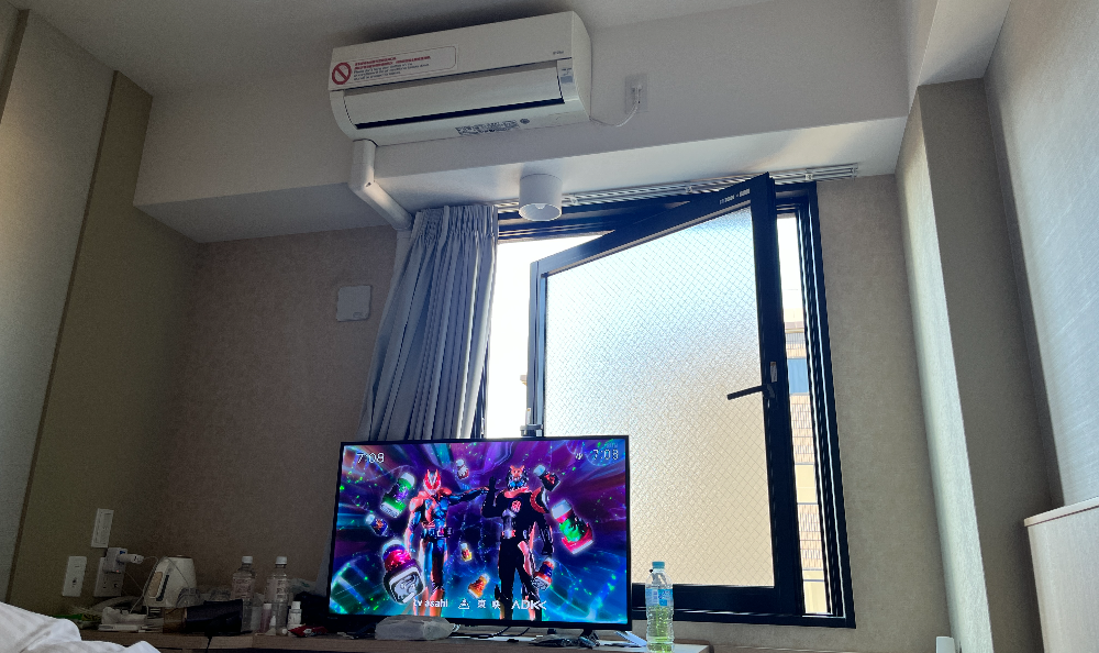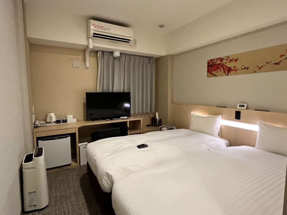 싱글 침대가 2개 있습니다. 방은 딱 사용할 만큼의 공간으로 구성되어 있었는데 일본 숙소들이 대부분 좁다고 들었기 때문에 그러려니 했습니다. 2박 연박을 했는데 생활하는데 괜찮았습니다. TV 한국 호텔들보다 작은듯했고, 짐을 올려놓는 테이블이 있었으면 하는 아쉬움이 있었습니다. 한 명은 TV 옆쪽으로 짐을 풀고, 한 명은 공기청정기 옆쪽으로 놓았습니다. 의자는 접이식과 소파형식의 작은 의자가 TV 아래쪽으로 놓여 있었습니다. 침대는 그럭저럭 편한 편이었습니다.