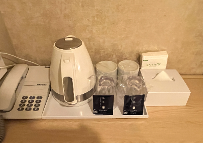 옷장은 따로 없고 벽에 옷걸이가 4개 걸려 있습니다. 드라이기와 탈취제, 조명이 있었습니다. 전화기 커피포트, 티슈, 녹차티백, 머그잔과 잔이 2개씩 준비되어 있습니다. 객실 간 전화는 0번을 누르신 후 객실번호를 누르시면 되고, 프런트 내선번호는 9번입니다. 냉장고에는 아무것도 없었습니다. 생수를 받으셨던 분도 있었는데 저희는 따로 없었습니다.