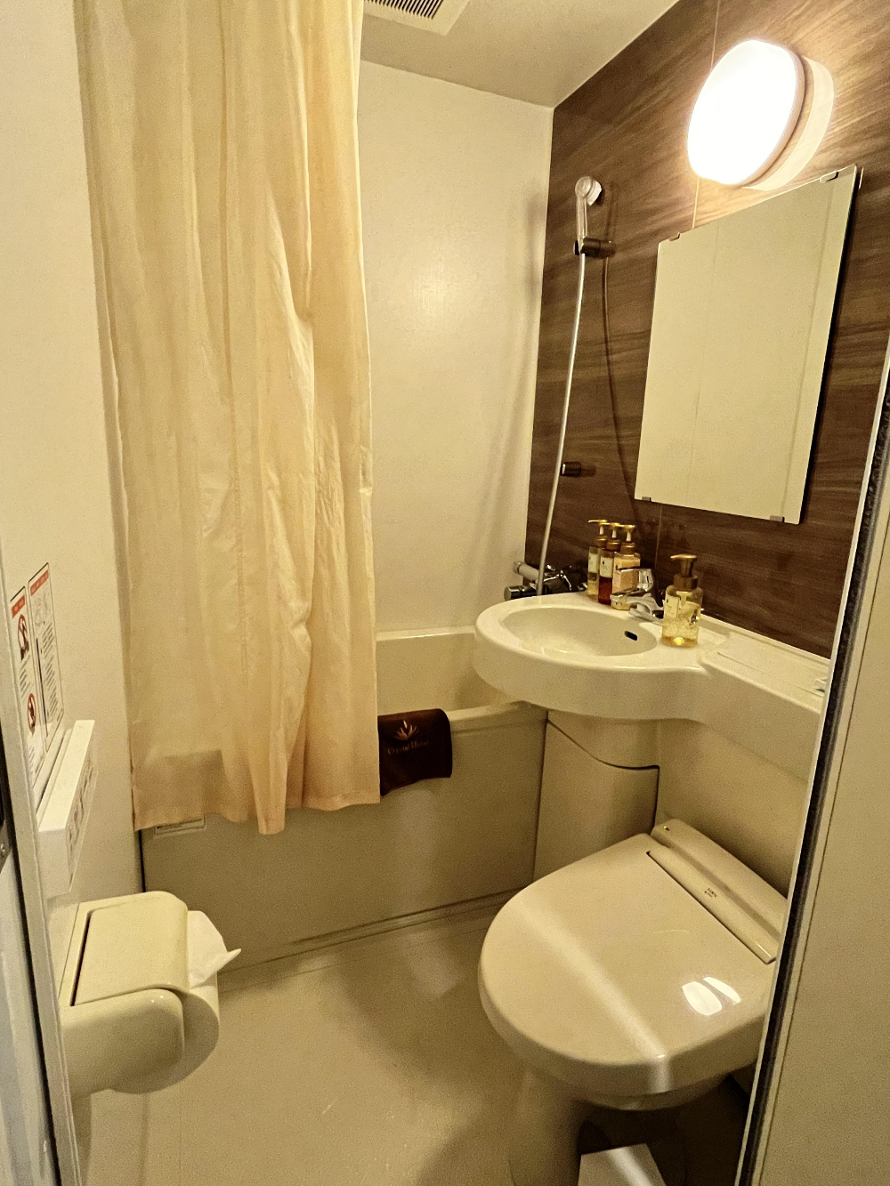 화장실을 처음 봤을 때는 조립식 화장실이라 공항 화장실 같은 느낌이 들었습니다. 이용하는데 불편함은 딱히 없었으나, 좁은 공간이 불편하신 분들은 참고해 주세요. 샤워하실 때 샤워커튼은 욕조에 넣고 샤워하시면 됩니다. 따뜻한 물은 종종 미지근한 물로 바뀔 때가 있었으나 전체적으로는 잘 나오는 편이었습니다. 샤워기는 해드를 돌려 분사방식을 바꾸실 수 있습니다. 일반방식에서 미스트로 변하는데 원하는 강도로 맞춰 사용하시면 됩니다. 다회용 샴푸, 컨디셔너, 바디워시가 준비되어 있는데 일본 뷰티브랜드 POLA 제품입니다. 일회용 칫솔과 치약, 양치용 컵이 있습니다.