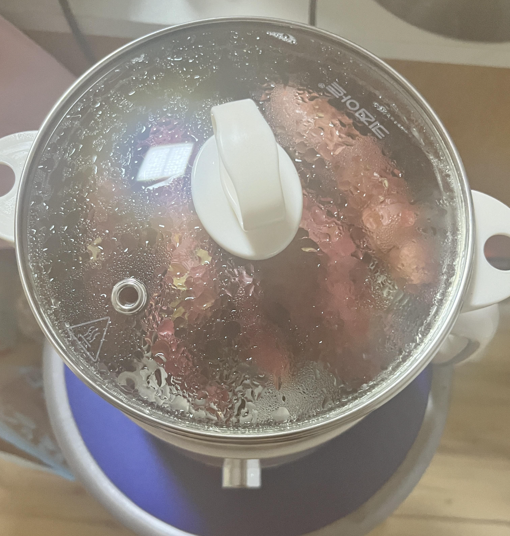 고구마를 삶고 있습니다. 고구마 양이 꽤 되는게 보이지요? 저는 빨리 삶기 위해 고구마를 꼭 가로, 세로로 잘라준 다음 삶습니다. 물이 끓는 소리가 나고 슬슬 고구마가 삶아지는 냄새가 납니다. 불을 끄시면 됩니다. 따로 타이머 설정을 할 수는 없지만, 불편한 것은 없습니다.
