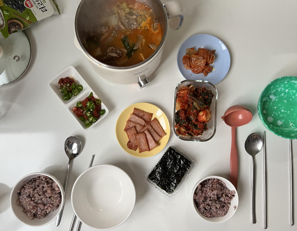 가볍게 차린 밥상입니다. 엄마에게 얻어온 달랑무, 소박하지만 등심을 사서 빵가루를 묻혀 만든 돈까스, 간단한 나물과 김이 전부인 밥상이지만, 집에서 해먹는 밥이라 소중한 자취생 밥상입니다. ^^ 이때 멀티쿠커에 국을 끓이면 먹을 만큼 따뜻하게 데워서 바로 바로 먹을 수 있다는 점이 가장 큰 장점입니다.
