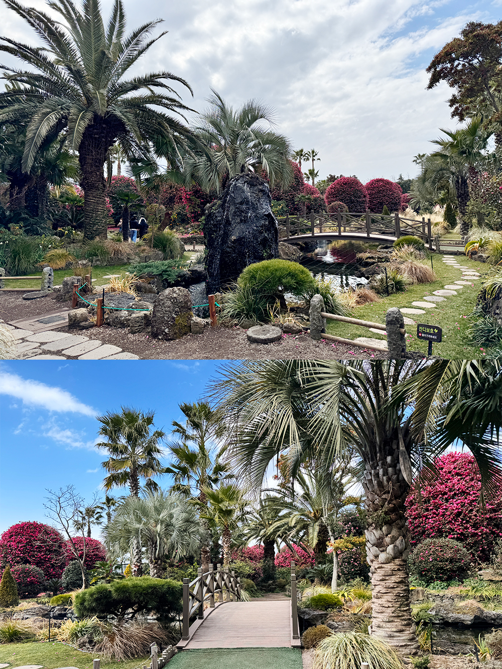 제주도 겨울여행을 하시면 북쪽보다 남쪽을 많이 하시는 걸 추천드리는 이유는, 아무래도 남쪽이 조금 더 따뜻합니다. ^^ 제주도는 한라산이 높이 있어 제주 동, 서, 남, 북 날씨가 다양한 날들이 많이 있기 때문에 여행 중 날씨 확인을 꼭 해보시고, 이동경로를 짜시는 것도 좋습니다. 제가 동백수목원을 찾은 날도 남원쪽은 날씨가 맑았는데 북쪽은 비가 왔었습니다. ^^ 꼭꼭! 잊지 말고 날씨 확인하고 출발해 보세요!