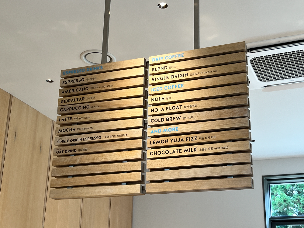 역시 깔끔한 인테리어! 멋지단 생각이 들었습니다. 모두 더 전문적여 보이는 느낌이었습니다. 입구에 들어서서 바로 주문을 하고 자리에 앉아서 기다리면 되는 구조였습니다. 줄서서 기다리면서 굿즈 제품들을 구경할 수 있습니다.