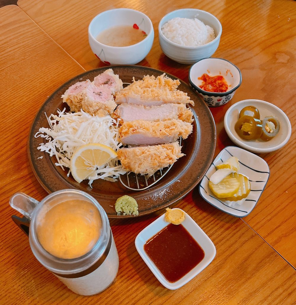 모듬카츠가 나왔습니다. 저온 교차 숙성한 등심과 안심의 프리미엄 흑돼지 돈가스입니다. 둘 다 맛있어서 항상 모듬을 먹게 되는 것 같습니다. 동그랗게 생긴 돈가스가 히레카츠로 안심부위인데 정말 촉촉합니다. 길죽한 것은 로스카츠로 등심입니다. 지방 부분까지 두툼하게 있지만 느끼하지 않고 맛있었습니다. 두꺼운 고기가 이렇게 부드러울 수 있을까? 하는 생각과 어떻게 익혔을까 하는 궁금증으로 먹었던 것 같습니다. 사이드로 나온 샐러드도 함께 주신 소스와 함께 먹음 고소하니 맛있습니다. 취향에 따라 와사비를 즐기셔도 좋습니다. 돈가스 소스도 맛있었습니다.