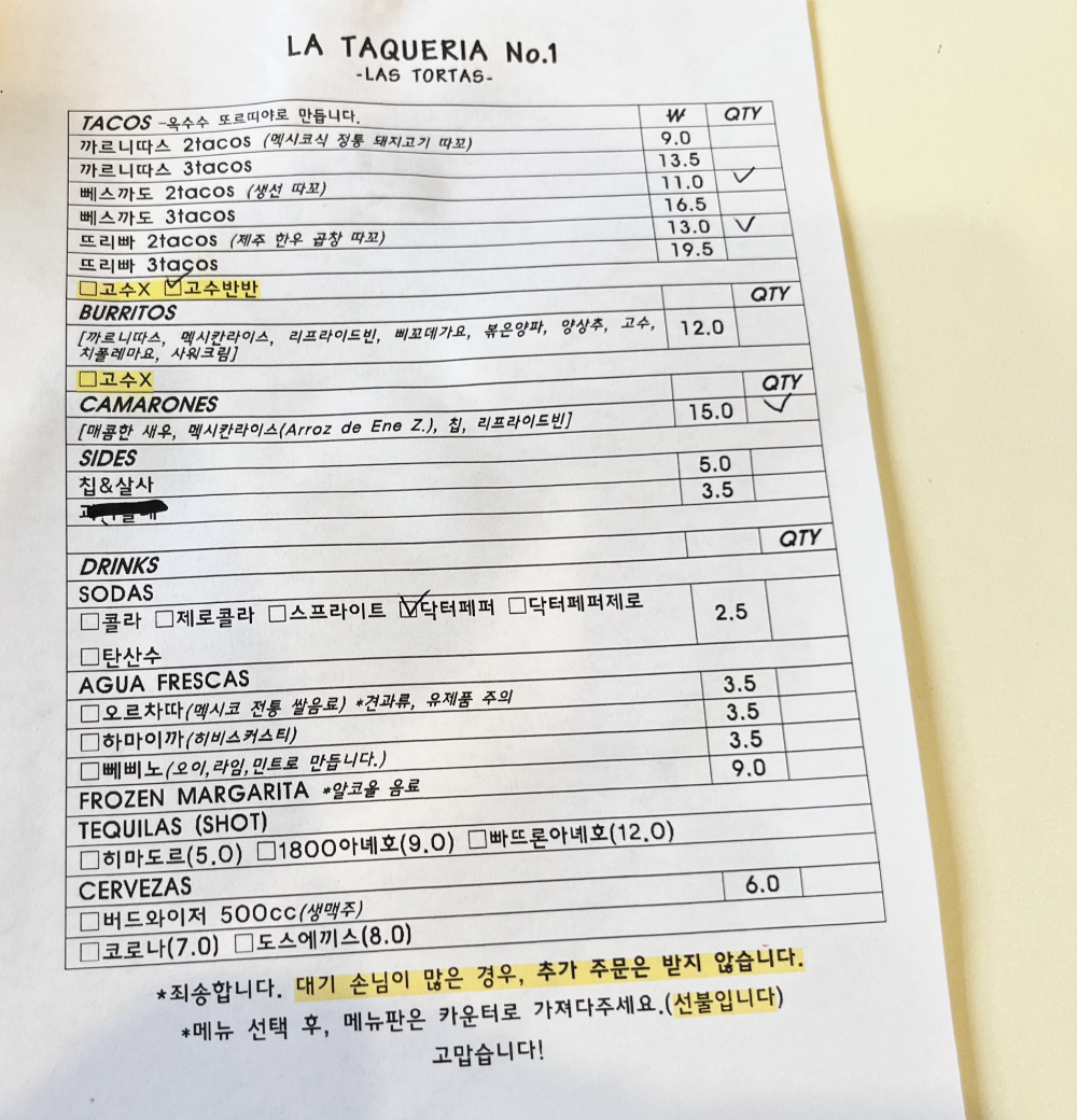 마치 수기로 적은 듯한 종이 한 장에 볼펜으로 원하는 메뉴를 체크해주시면 됩니다. 저는 뻬스까도(생선따꼬/달고기), 뜨리빠(제주한우곱창 따꼬), CAMARONES(매콤한 새우, 멕시칸라이스, 칩, 리프라이드빈)을 주문했습니다. 메뉴가 참 발음하기 힘들어서 종이만 쓰윽 건넸습니다. ^^ 생선따코가 너무 맛있다고 소문을 많이 들어서 너무 맛보고 싶었습니다. 다들 달고기라고 불렀는데 처음에 메뉴판에 안 쓰여있어서 못 찾을 뻔했습니다. 달고기타코는 생선타코! 잊지 마세요!