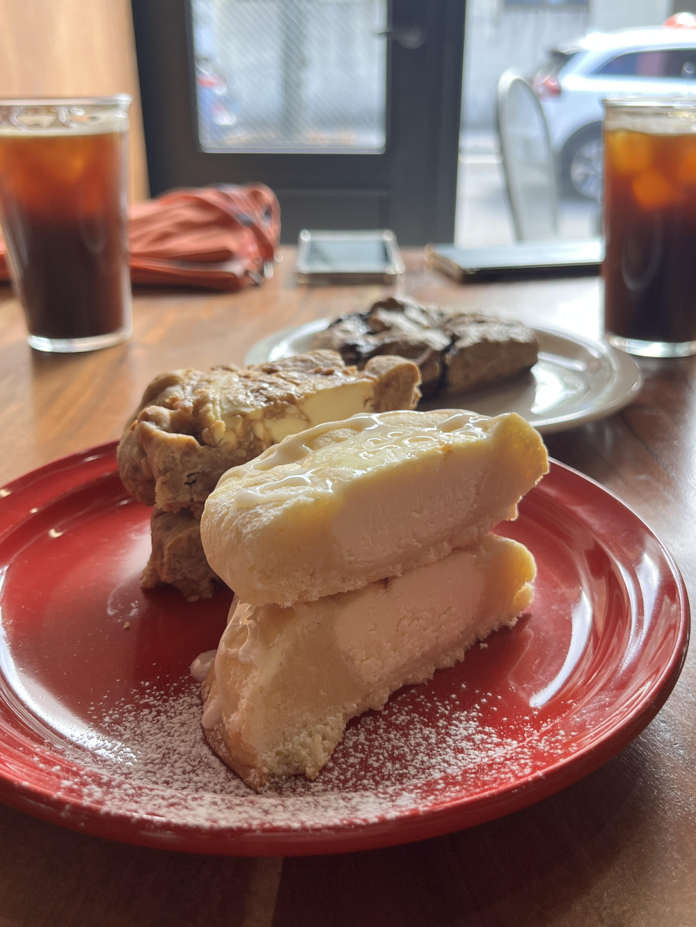 저는 블루보틀에서도 그랬지만, 역시라 라떼를 좋아하기 때문에 라떼를 선택했고, 쿠키의 선택은 다른 사람들에게 맡겼습니다. 다 맛나보여서 못 고르겠습니다. 흑흑… 위가 조그마하신 분들은 먹고 남은건 포장해가시면 좋겠습니다. 저희도 두조각은 남겨서 포장해왔습니다. ^^ 포장할때는 그냥 싸주셨던것 같은데 매장에서 먹을땐 아주 조금 뎁혀주시는 것 같았습니다. 치즈들이 더 부드러운 느낌이었습니다.