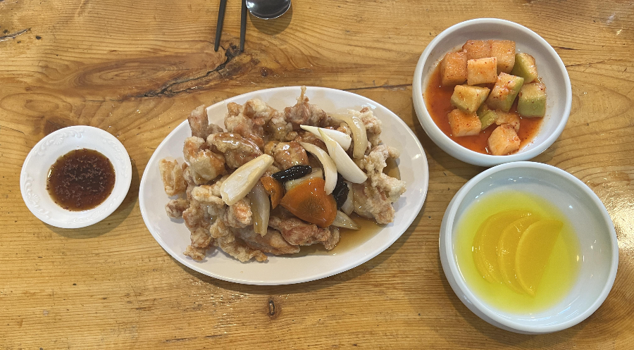 닭탕수육과 기본 세팅입니다. 닭탕수육 소스에 오이가 있는데 저희는 빼달라고 했습니다.